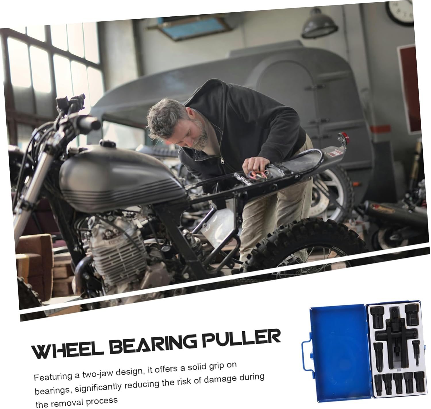 List 10 x bearing removal tools Characteristics -Material:Alloy motorcycle bearing pullers -Size:22.00X15.00X4.50cm/8.65X5.89X1.77in wheel bearing tool -Color:Blue motorcycle wheel bearing puller -This versatile steering wheel puller kit is designed to handle a wide range of motorcycle bearing removal tasks, making it an essential addition to any mechanic's tool kit bearing removal tool. -Crafted from high-strength materials, this bearing puller tool exceptional durability and longevity, ensuring it withstands the of frequent use bearing separator kit. -Featuring a two-jaw design, it offers a solid grip on bearings, significantly reducing the risk of damage during the removal process wheel bearing removal tool. -The tool is engineered for simplicity, allowing users to perform bearing removal quickly and conveniently without requiring extensive technical knowledge bearing disassembly puller.Goods Descriptionbearing puller separator kit The two-jaw design provides a secure grip on the bearing, minimizing the risk of damage during removal.wheel bearing removal tool Crafted from alloy materials, this tool ensures durability and long-lasting performance.gear puller Our motorcycle wheel bearing puller is designed for versatility, making it suitable for a wide range of motorcycle models.motorcycle wheel bearing puller Its user-friendly operation allows for quick and easy bearing extraction, saving you time and effort.bearing separator kit Packaged in a sleek storage box, it is convenient to carry and store, making it an essential addition to your motorcycle tool kit