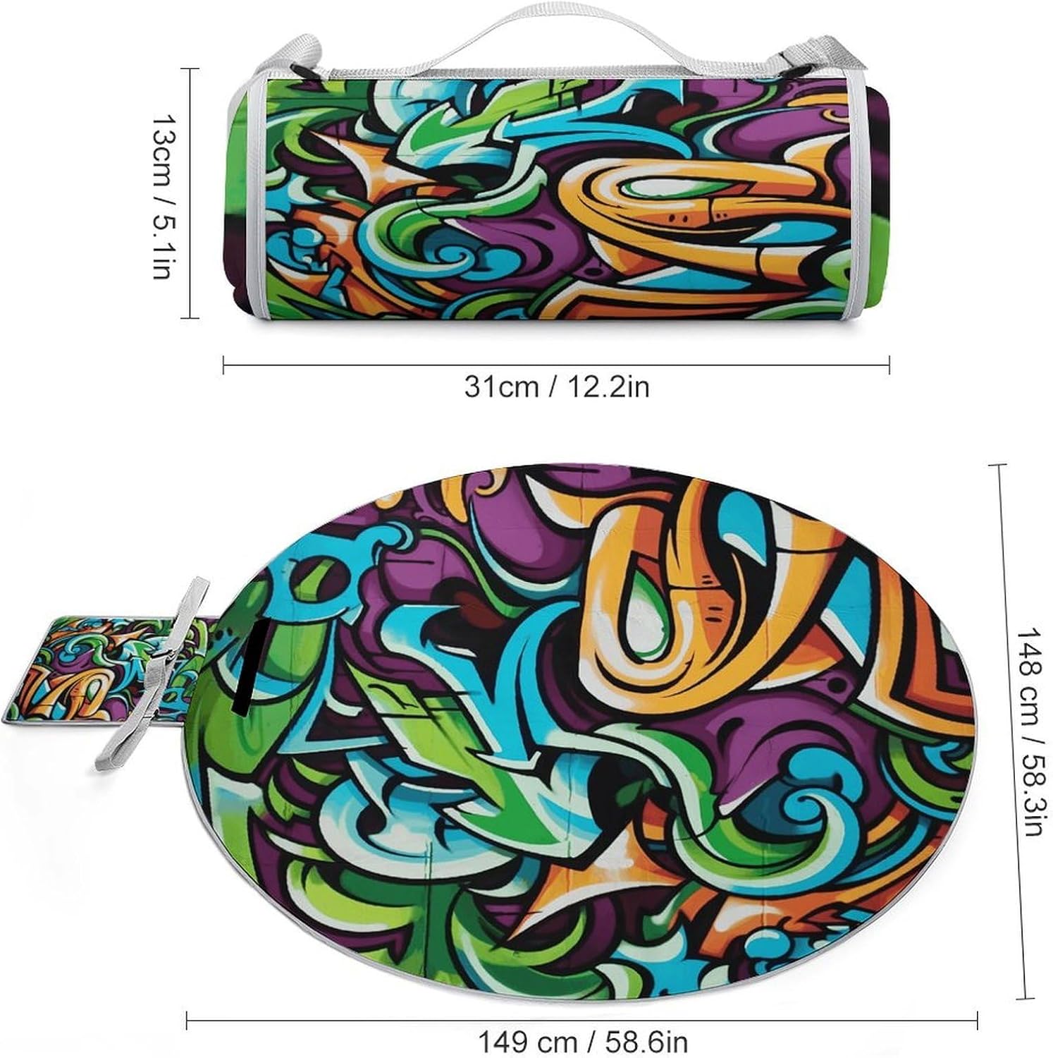 This isn’t just another round outdoor Graffiti Drawing Art picnic mat.It’s a considered companion for life outdoors:a soft camping mat that cradles you without bulk,a washable picnic mat that laughs off spills and sand,and a compact beach mat that tucks away as neatly as it appears.Whether you’re spreading it beneath a canopy of maple trees for a family picnic,anchoring it on powdery sand for beach days,or laying it over cool stone for an outdoor concert,its balanced round silhouette feels intentional-not accidental. What makes this circular outdoor Graffiti Drawing Art picnic mat feel different is what lies beneath the surface.The top layer is fleece that warms without overheating,breathing with you during long hiking rests or shaded sports activities.Beneath it,a responsive sponge core adds subtle give-enough to soften hard ground,yet firm enough to hold shape through repeated camping nights or backyard play marathons.Just smooth,even compression into a tidy cylinder secured with Velcro,ready for the trunk,the bike basket,or the carry-on.Season after season,this circular outdoor Graffiti Drawing Art picnic mat meets you where you are.In spring,it’s your grass lawn blanket for picnics among blooming forsythia.In summer,it doubles as a soft camping mat under starlit skies and a beach days anchor against shifting tides.Come fall,it becomes a warm courtyard blanket for apple cider and firelight;in winter,a wind-buffered outdoor picnic mat beside a backyard fire pit.It’s equally at home during sports activities on paved courts,as a yoga blanket on dewy lawns,or as a relaxed family dinner surface on the patio.