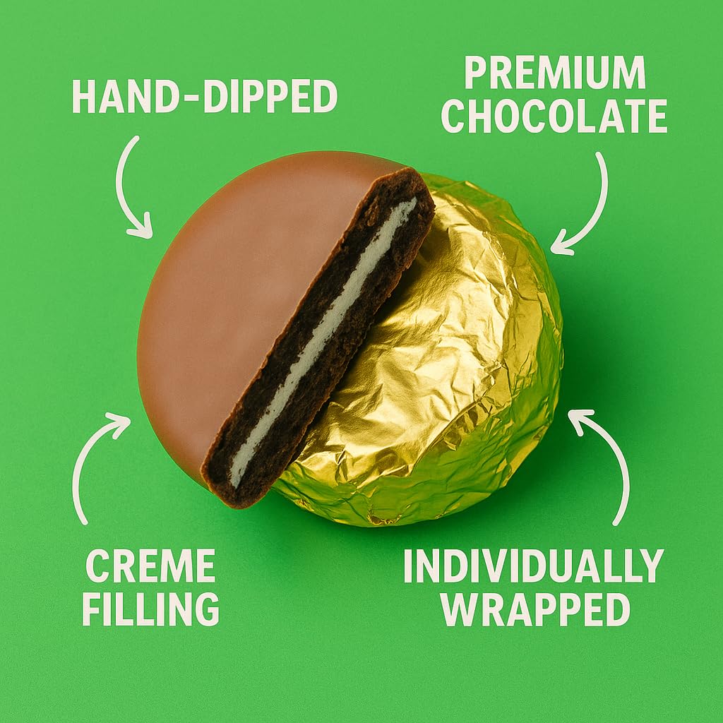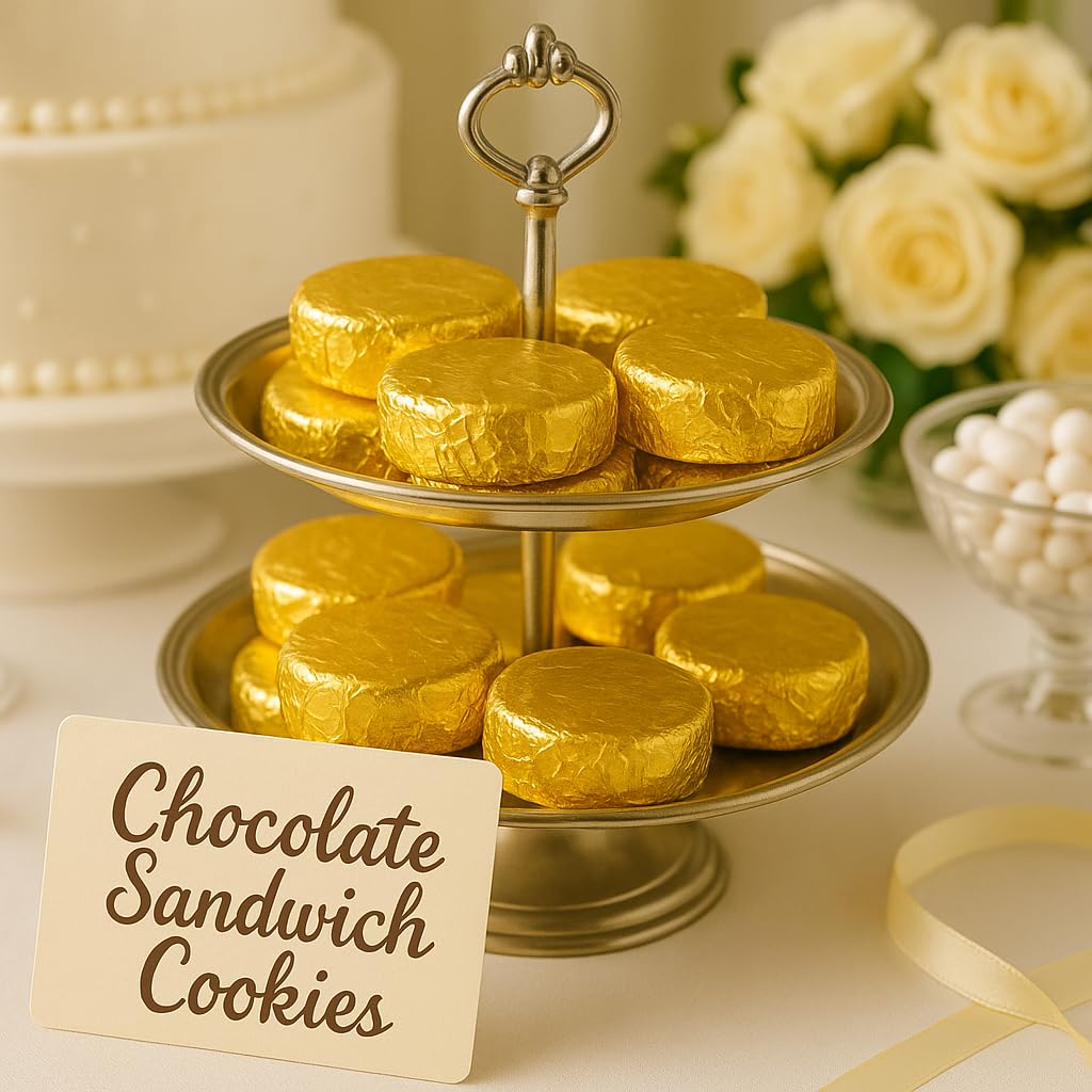 Gold Foil-Wrapped Chocolate-Dipped Sandwich Cookies 50 Count Bulk Pack Indulge in elegance and flavor with our Gold Foil-Wrapped Chocolate-Dipped Sandwich Cookies, the perfect fusion of gourmet taste and luxurious presentation. Each cookie is hand-dipped in rich, premium chocolate and wrapped in shimmering gold foil, making every bite a celebration of quality and care. Whether you’re building upscale gift baskets, stocking your wedding candy table, or impressing clients with thoughtful corporate gifts, this 50-count bulk pack delivers both convenience and charm. The cookies are individually wrapped, keeping them fresh and ready to serve straight from the bag no prep needed. Crafted to order in small batches, these cookies offer a satisfying crunch with a creamy center, coated in velvety chocolate for a melt-in-your-mouth experience. From holiday parties to baby showers and office events, they’re an instant hit that elevates any occasion. Premium Ingredients – Smooth, hand-applied chocolate Elegant Appearance – Eye-catching gold foil wrapping Bulk Convenience – 50 cookies per order Freshly Made – Baked and dipped to order Versatile Use – Perfect for gifting, events, and displays Treat your guests or clients to a cookie that’s as beautiful as it is delicious. Fresh. Fancy. Foil-wrapped perfection.