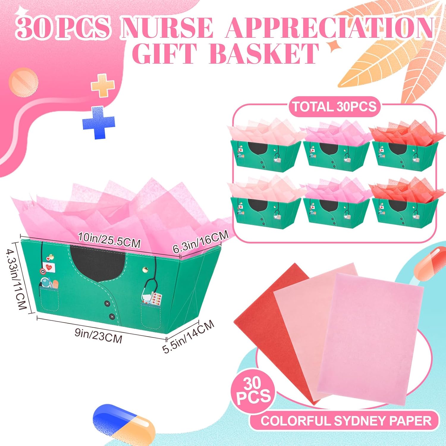 Features: This gift basket supply kit arrives fully ready for your creative touch, requiring no complicated assembly. The paper gift basket design lets you quickly put together thoughtful, personalized gifts for any occasion. Choosing these baskets in bulk offers outstanding value, letting you stock up on empty gift baskets without exceeding your budget. They are a practical choice for event planners and anyone looking to prepare multiple gifts. Specifications: Material: paper Color: blue Size: About 9.1 × 4.3 × 5.5 inch Package includes: 30 Pcs paper basket 10 Pcs pink tissue paper 10 Pcs Light pink tissue paper 10 Pcs Dark pink tissue paper Notes: Manual measurement, please allow slight errors on size. The color may exist a slight difference due to different screen displays