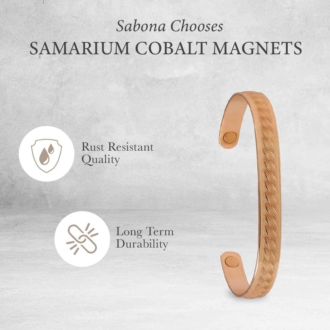 Product Description Sabona Copper Rope Magnetic Wristband features an elegant rope design with a classic satin finish and offers a unique elegance for any occasion. It is designed for comfort & manufactured to maintain its shape & quality appearance. Sabona chooses Samarium Cobalt rust-proof magnets for long-term durability and rust-resistant qualities. Sabona Copper Rope Wristbands are made with the purest copper available-99.99% pure! The magnetic wristbands or cuff styles have a 1700 gauss rust-proof samarium cobalt magnet in each tip and a brushed finish to give it a stylish look. Clean your Sabona Magnetic Copper Rope Wristband with a good jewelry cleaning cloth to keep the outside polished & the inside clean. It can be removed with soap & water or lemon juice. Your bracelet comes packaged in a presentable clear clamshell. Magnetic Wristbands should be snug, but not tight. If you are in between sizes, it works better for the band to be smaller rather than larger. To get the best fit, subtract ½" to ¾" from your wrist size to determine the size of the Sabona Copper Wristband you need. Sizes are Small (5.5"), Medium (6.0"), Large (6.5") or X-Large (7.0") About the Brand Sabona manufactures and markets fine copper and magnetic bracelets worldwide. Established in 1959, Sabona has offices in England and in the United States, and is internationally recognized as the premier marketer of copper and magnetic bracelets due to strict standards of quality and fine craftsmanship. The Copper Theory Various forms of copper have been used for medicinal purposes throughout the history of mankind. The ancient Egyptian, Greek, Roman, Persian, Hindu and Aztec writings record various consistent medicinal uses of copper.1 Today, as more information becomes available, alternative health care and home remedies are gaining popularity. Health publications include copper bracelets as a home remedy to possibly ease the pain from arthritis in some people who seem to get an insufficient amount of copper from their food. Helmar Dollwet, Ph.D., of the University of Akron, has studied this copper connection and thinks the dissolved copper from a copper bracelet entering the body through the skin may be the only way for them to get the copper they need.2 Another study found patients wearing copper bracelets absorbed an average of 13 milligrams of copper during a month. "This could bring many people into the recommended daily intake for copper (1.5 to 3 milligrams). Copper absorbed through the skin gets into circulation very efficiently more so than most dietary copper." Superoxide Dismutase (SOD) is one of the bodys own copper-dependent enzymes that reduces pain and inflammation. The body may use copper to make more of its own SOD.3 1 Dollwet & Sorenson, "Historic Uses of Copper Compounds in Medicine" TRACE ELEMENTS IN MEDICINE, Vol.2, No.2-1985 (pp.80-87) 2 Tkac, Debra, Ed. "The Case for Copper" THE DOCTORS BOOK OF HOME REMEDIES, (p.22) Copyright 1990, Rodale Press, Inc. 3 Passwater, Richard A., Ph.D., "Copper and SOD" THE NEW SUPERNUTRITION, (p.256) Copyright 1991, Pocket Books, Simon & Schuster, Inc. The Magnetic Theory Magnets have been used in different cultures over the years by those who believe magnets worn on the body promote good health. The theory is that magnet therapy may be beneficial by affecting the circulatory system, the blood flow in the body. Increased circulation is beneficial because the body gets more of the nutrients it needs from the blood.